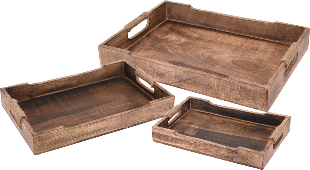 Sæt af 3 serveringsbakker i brændt mangotræ med rebhåndtag