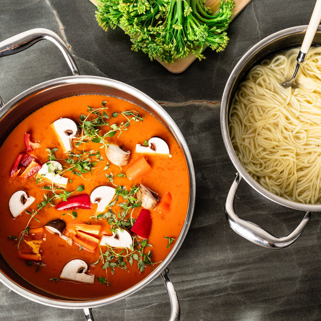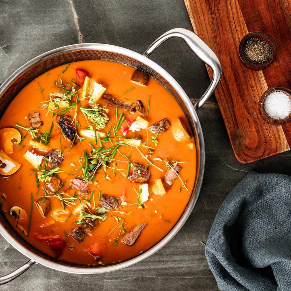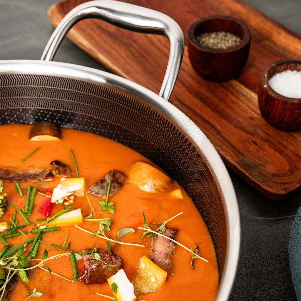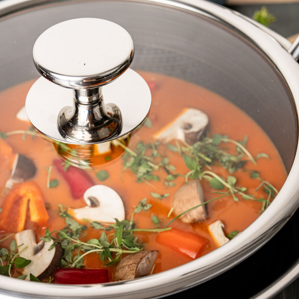 Gryden bliver fremstillet med hele 3 lag høj kvalitets stål. Det første lag består af stærkt rustfrit stål. Det rustfrie stål sikrer, at gryden kan fungere på alle typer komfur. Det andet lag består af et lag aluminium. Aluminium er med til at give gryden en god varmefordeling. Til sidst kommer der endnu et lag rustfrit stål, som sikrer en yderst høj holdbarhed. Til sidst bliver gryden belagt med den innovative non-stick belægning, som til sammen skaber den helt perfekte gryde!