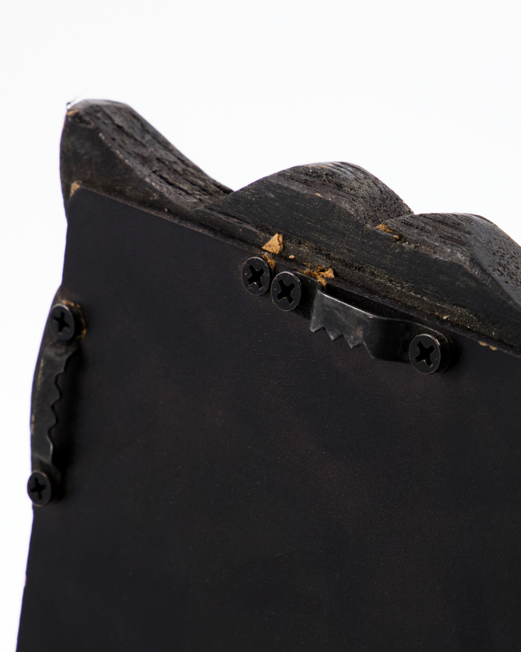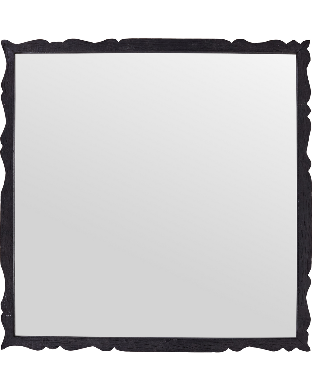 Et dekorativt spejl med håndlavet, udskåret ramme i brunt, genanvendt træ giver din bolig et strejf af personlighed og varme