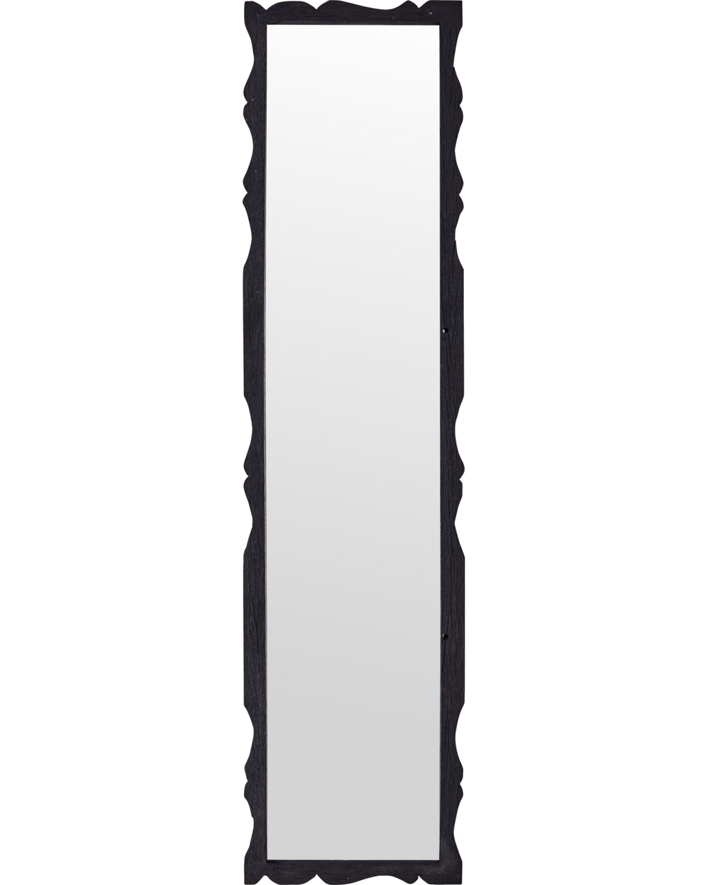 Et smalt spejl med bølget, brun ramme i genanvendt træ, som skaber varme og personlighed i hjemmet