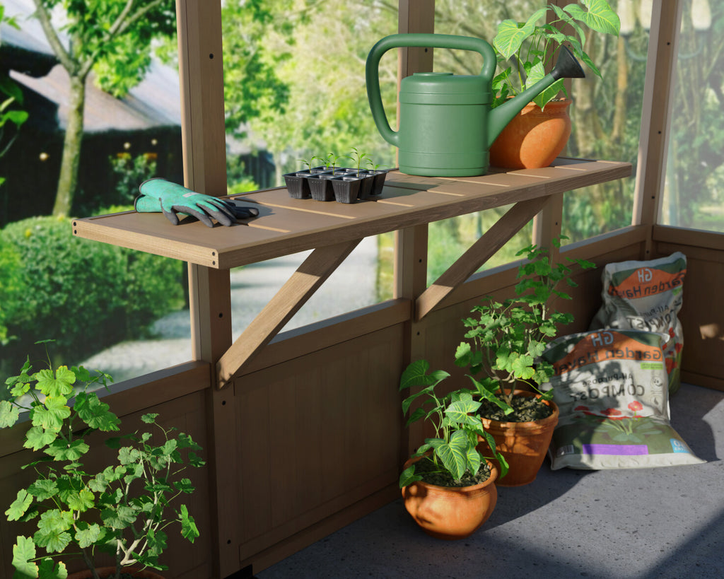 Giv dit Natura Cedar drivhus et ekstra løft med denne elegante og funktionelle træhylde i mocca-farvet cedertræ. Perfekt til opbevaring af potter, værktøj og småting – og samtidig et stilfuldt match til drivhusets naturlige udtryk.