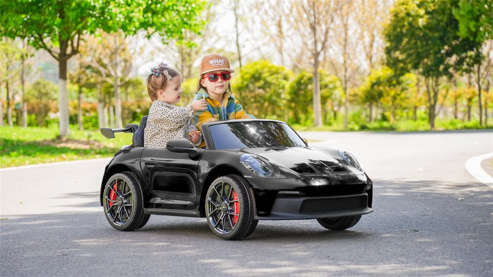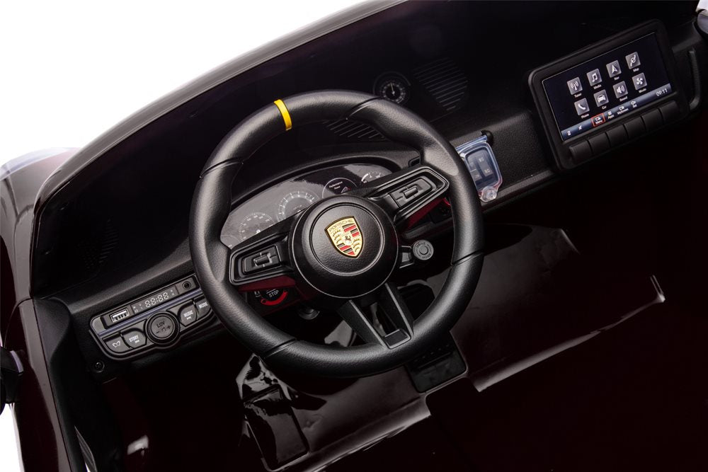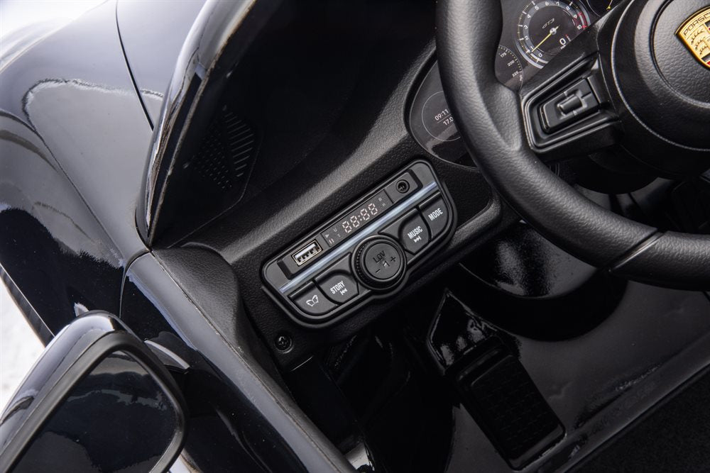 Forældrene kan trygt styre bilen via den medfølgende 2.4 GHz fjernbetjening, mens børnene selv kan styre rattet, nyde lyden af motorstart, musik og lys i ægte Porsche-stil.