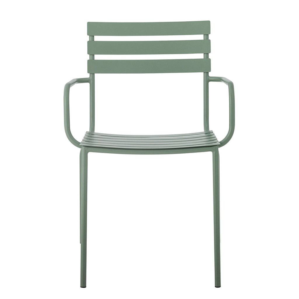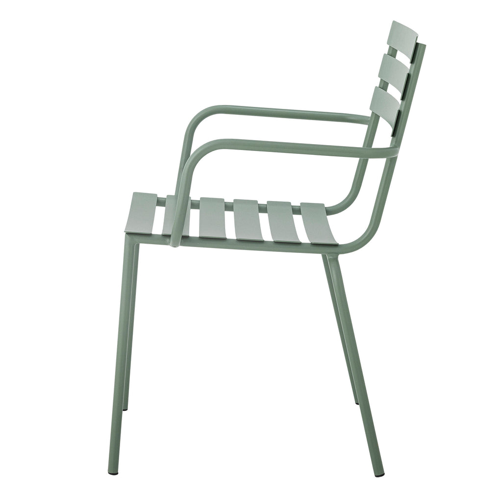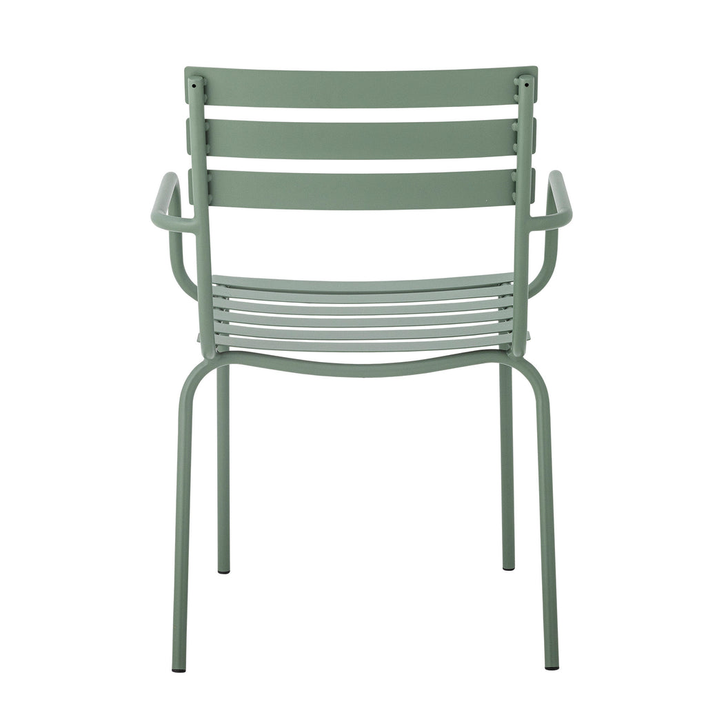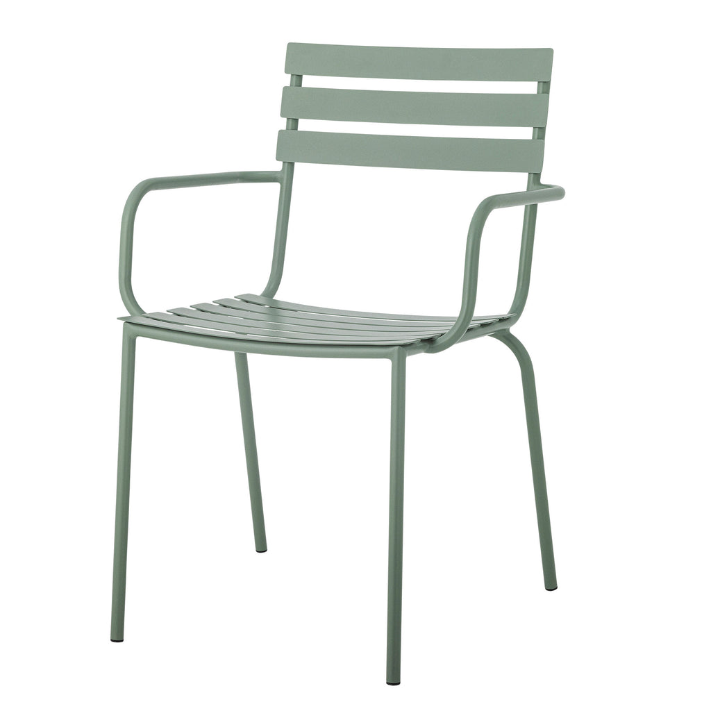 Monsi spisebordsstol fra Bloomingville er fremstillet af galvaniseret jern i en smuk grønlig farve. Den komfortable havestol med armlæn er nem at stable og egner sig perfekt til de lange, varme sommeraftener.