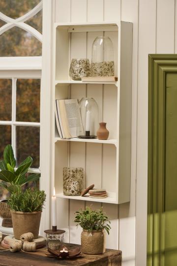 De tre rummelige hylder med en højde på ca. 28 cm hver gør den ideel til opbevaring og udstilling af kopper, krydderier, små bøger, små planter eller dekorative elementer.