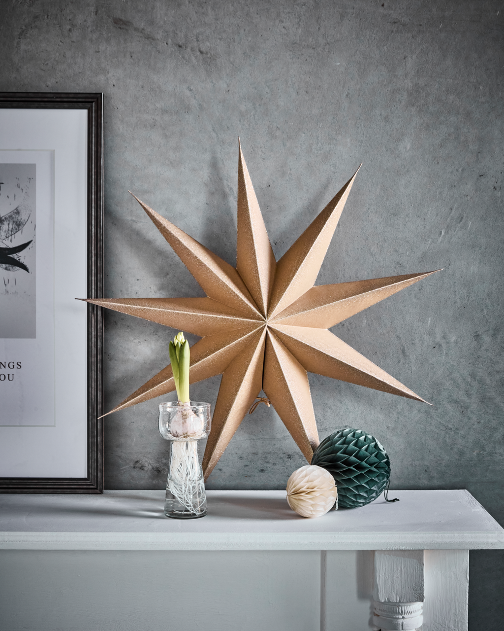 Skab en magisk julestemning med denne håndlavede stjerne i naturfarvet papir, pyntet med champagneglimmer