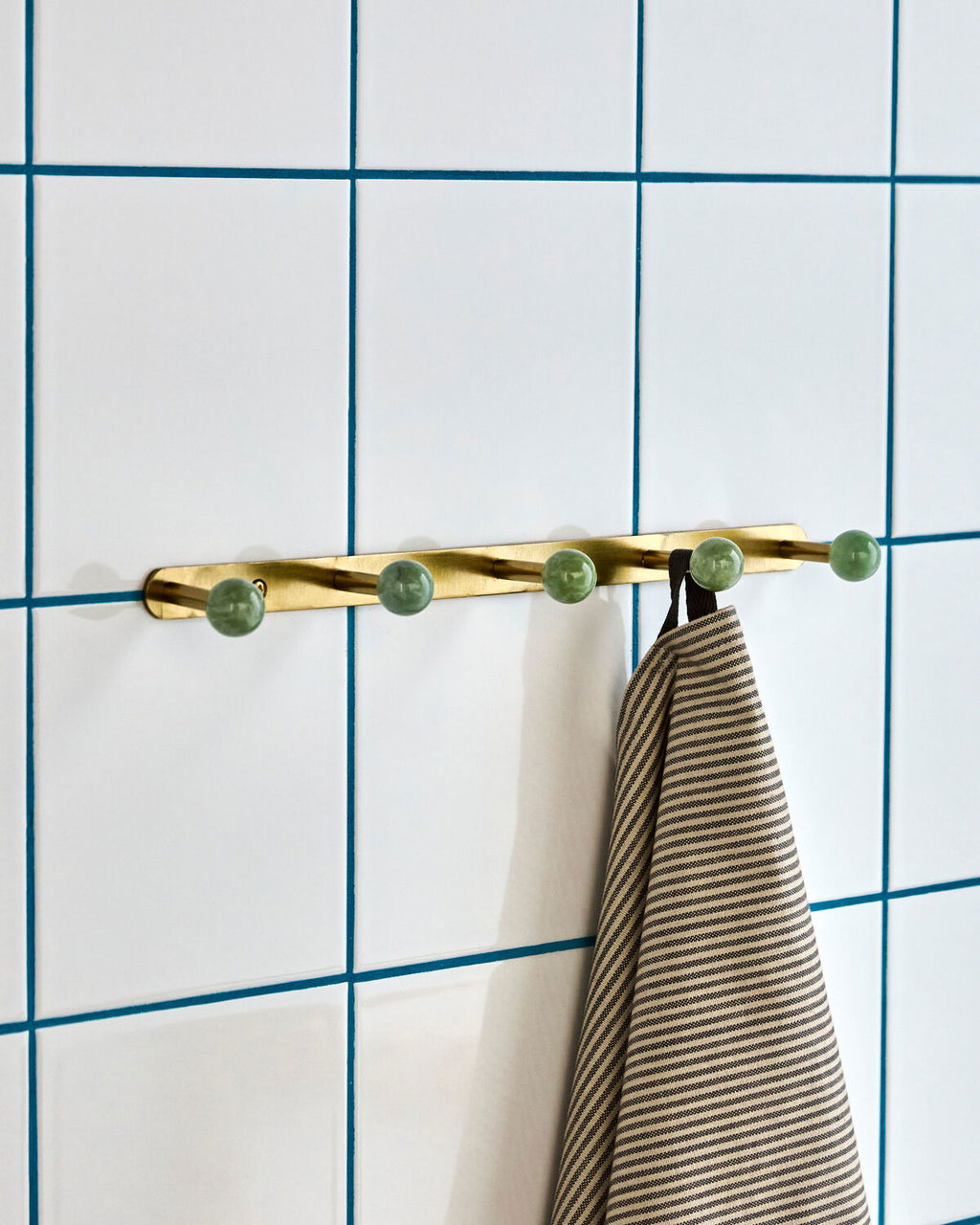 De fem runde knopper giver stilfuld opbevaring af viskestykker, håndklæder eller tøj og løfter stemningen i både køkken, entré og soveværelse.