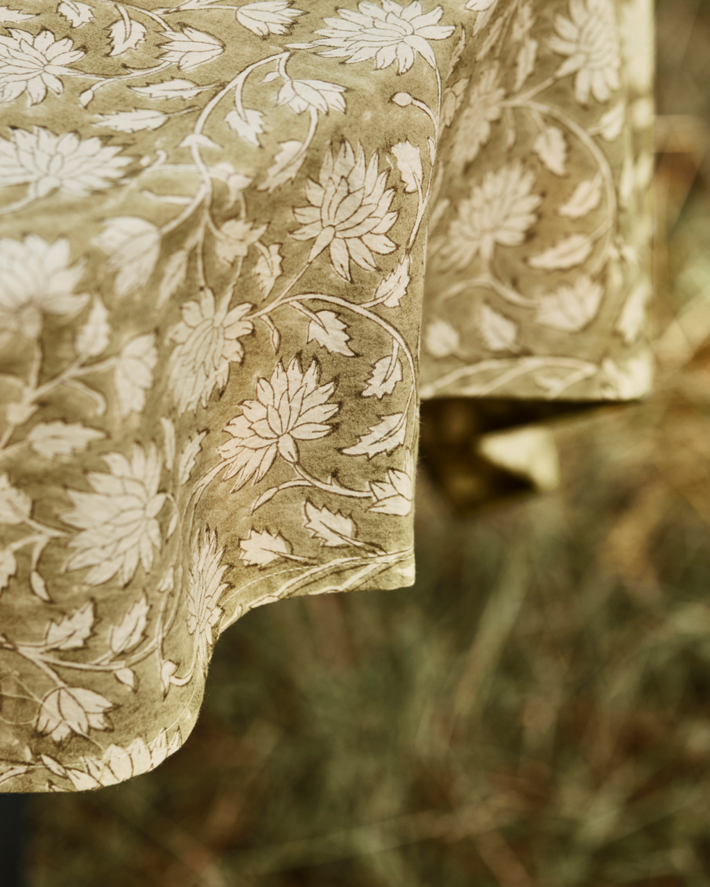 Den er fremstillet af 100 % bomuld og har et håndlavet blomsterprint i bløde grønne nuancer, som er perfekt til at skabe en frisk og indbydende atmosfære på dit sommerbord. Sæt den sammen med matchende servietter fra samme serie for et sammenhængende look. Overvej at tilføje dekorative servietringe for et ekstra lag af elegance til din spiseoplevelse.