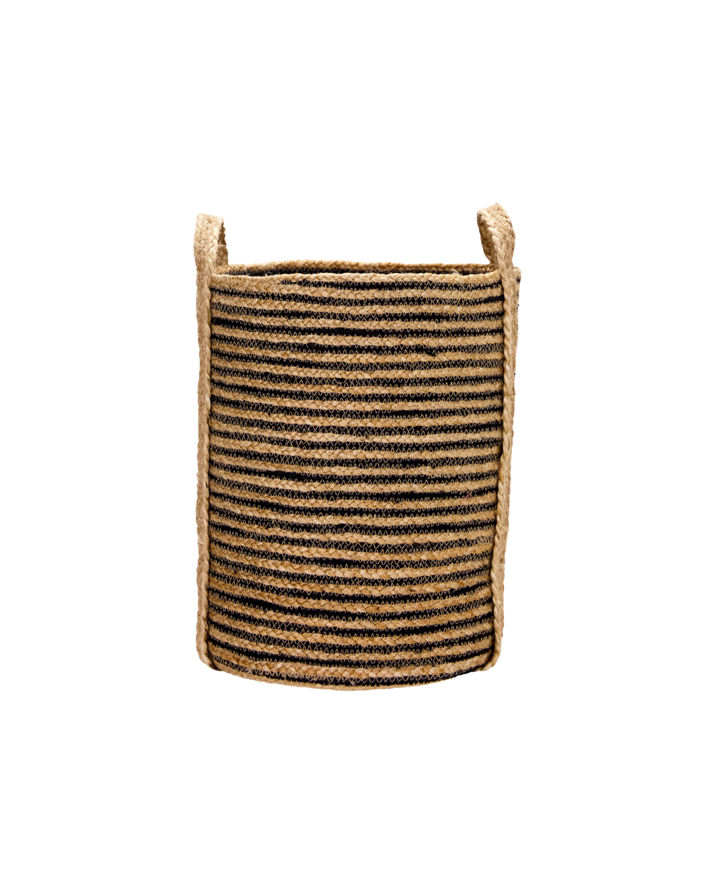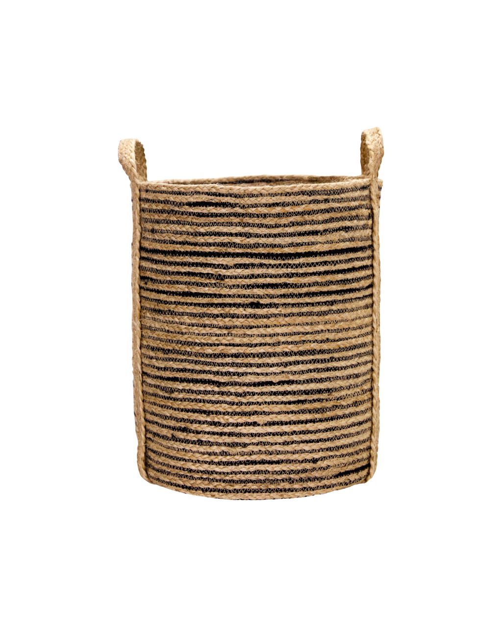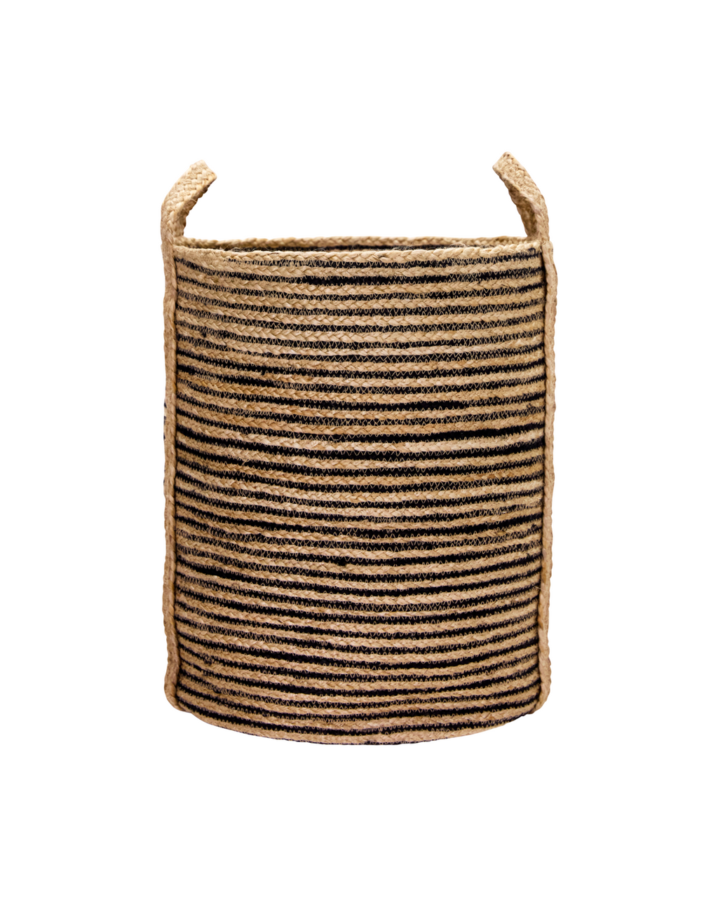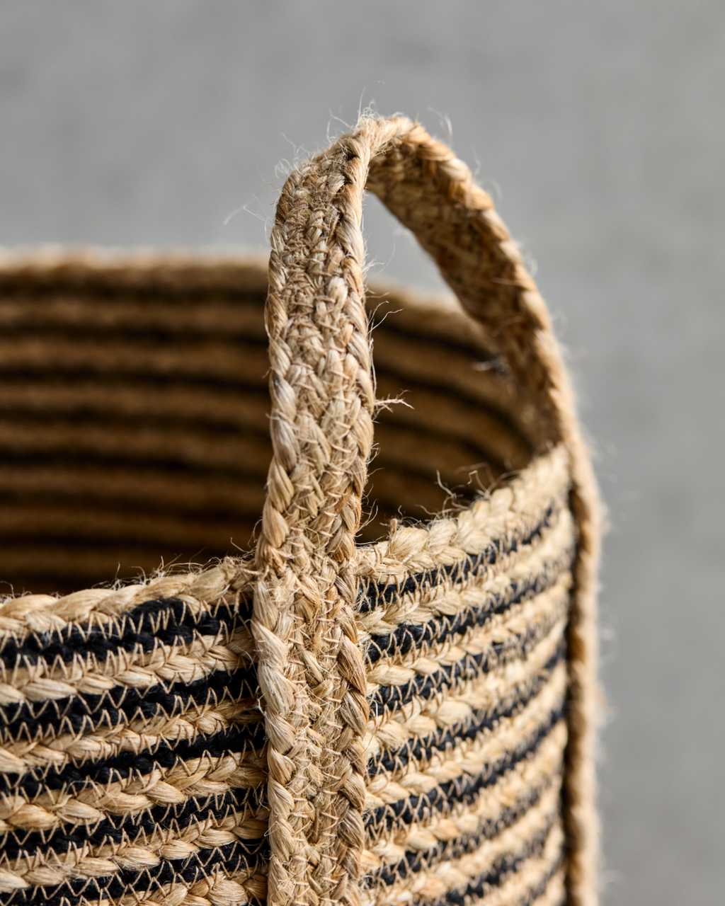 Jutefletningen med de kontrastrige sorte striber tilfører varme og tekstur til indretningen. Kurvene fungerer både som smart opbevaringsløsning og som et stilfuldt designelement, der giver personlighed til rummet.