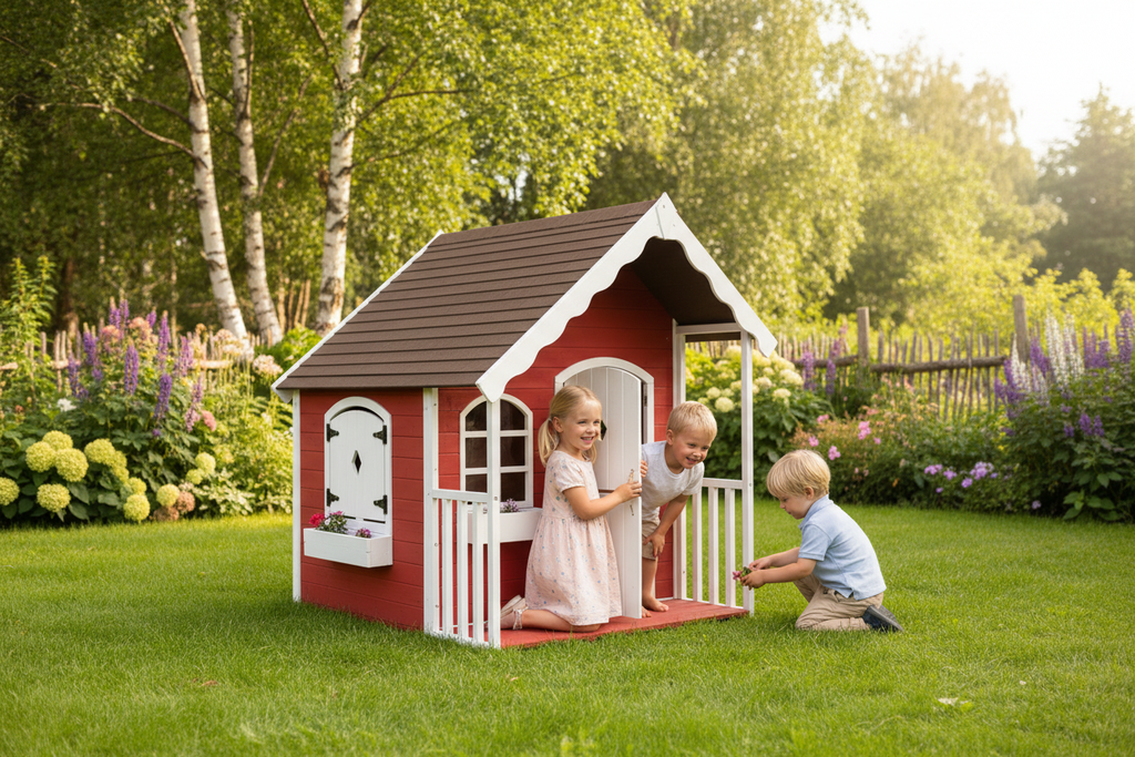 Nordic Play legehus - Fuldmalet i flot rød farve og med hvidemalede detaljer!