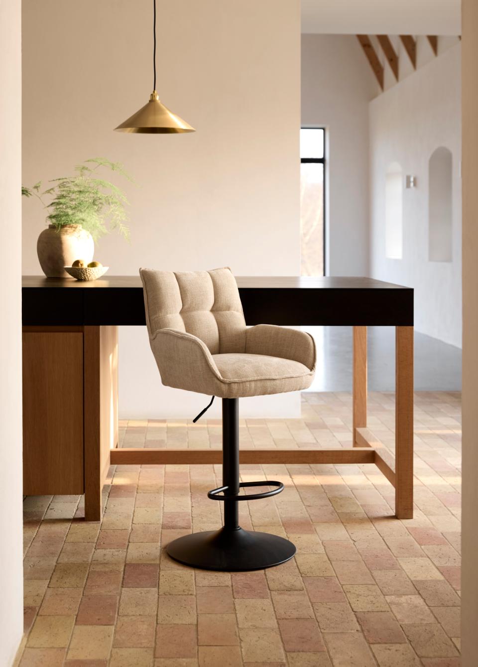 Elegant barstol med blødt chenille-stof og armlæn. Hørfarvet er neutral og tidløs. Højdejusterbar og drejbar - praktisk og komfortabel. FSC-certificeringen sikrer ansvarligt skovbrug.