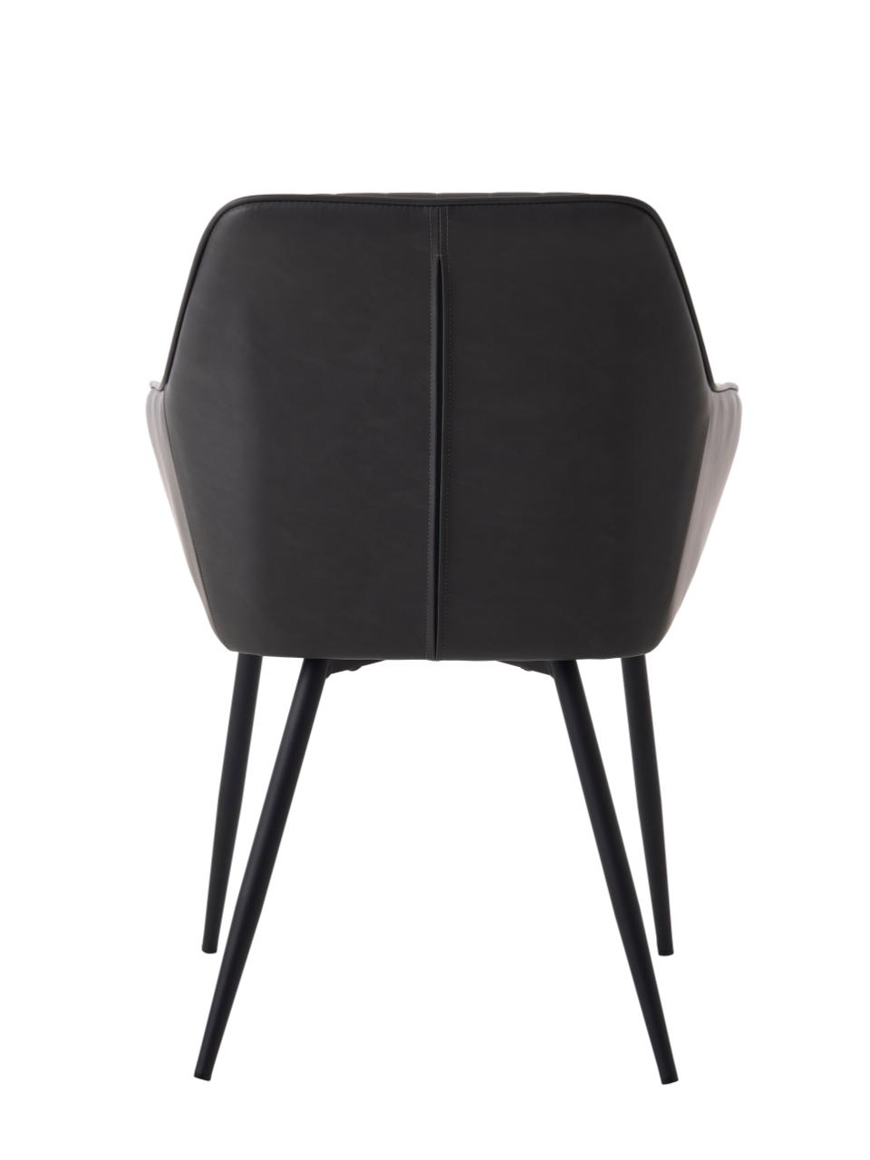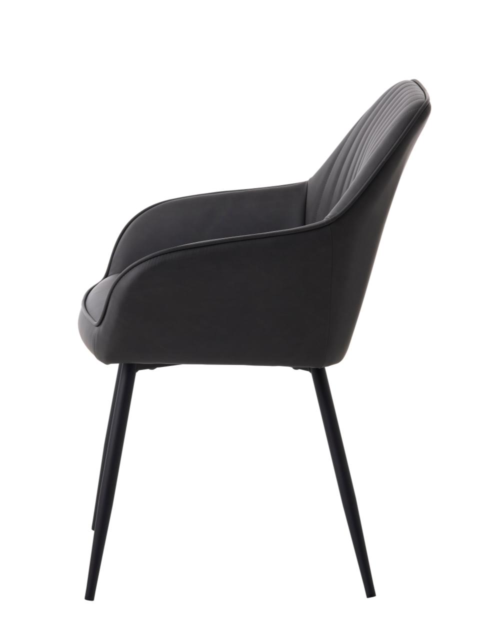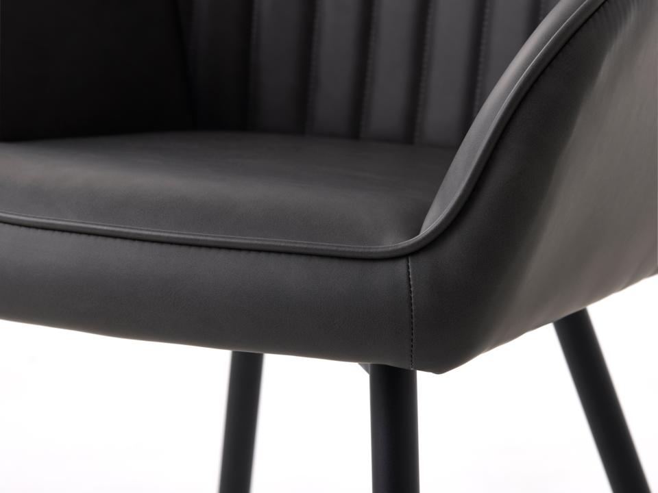 Med en siddehøjde på 48,5 cm passer stolen perfekt til de fleste spiseborde. Siddedybden på 43 cm giver god komfort, selv ved lange middage. Armlænene sidder i en højde på 60,5 cm og giver god støtte, når du sidder ved bordet. Ryggen er 84 cm høj og giver støtte til nakke og ryg. PU-materialet er nemt at rengøre og vedligeholde - perfekt til spisestuen, hvor der kan ske uheld. Med en Martindale-værdi på over 30.000 er materialet slidstærkt nok til daglig brug. De sorte metalben skaber en moderne kontrast til den mørkegrå PU-overflade.