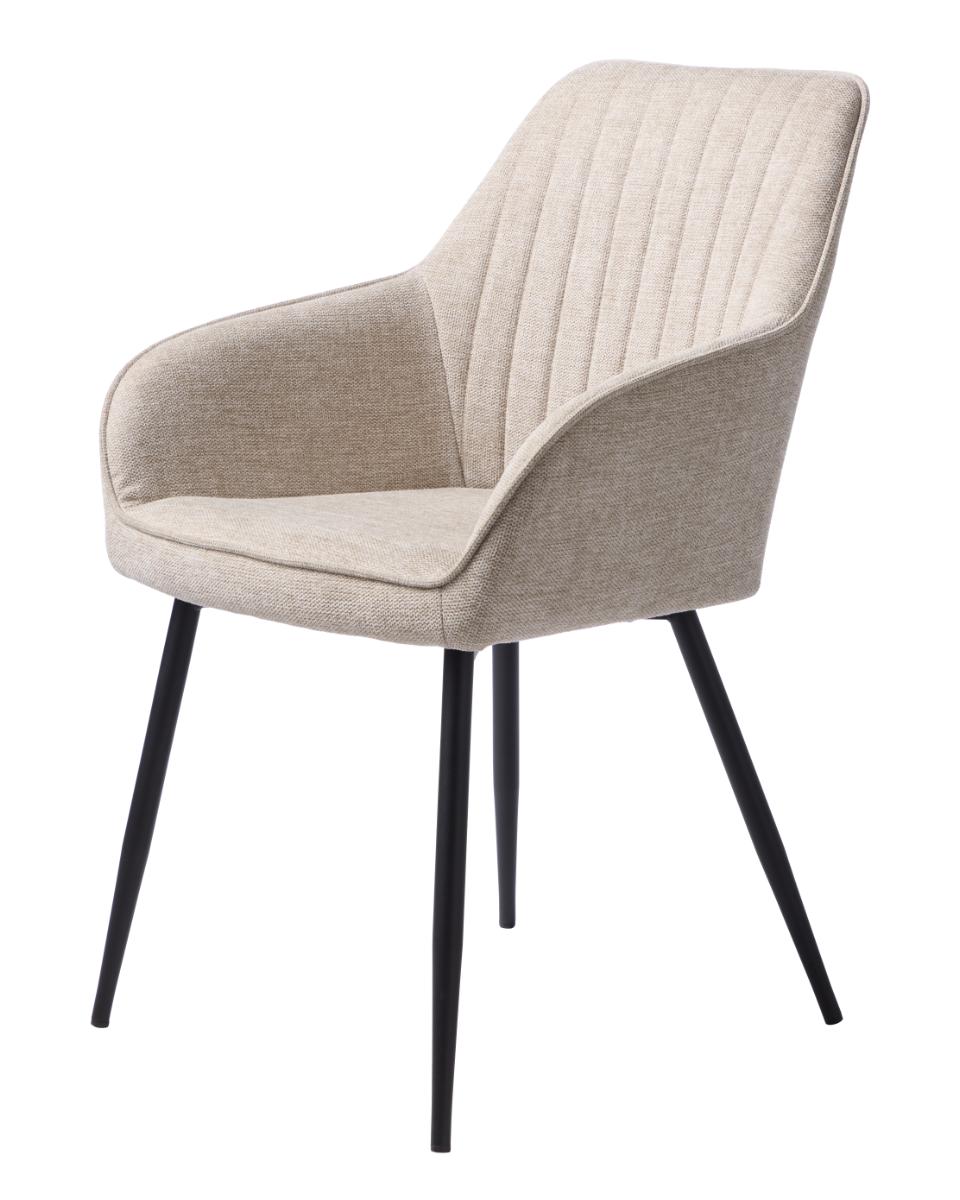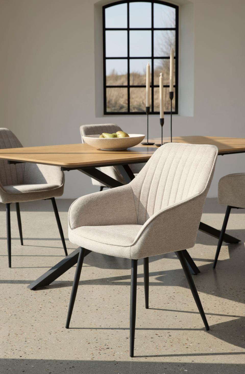 Med en siddehøjde på 48,5 cm passer stolen perfekt til de fleste spiseborde. Siddedybden på 43 cm giver god komfort, selv ved lange middage. Armlænene sidder i en højde på 60,5 cm og giver god støtte, når du sidder ved bordet - perfekt til lange middage, hvor samtalen flyder. Ryggen er 84 cm høj og giver støtte til nakke og ryg. Brego-stoffet er ekstraordinært slidstærkt med en Martindale-værdi på over 30.000 og modstandsdygtigt over for pilling - det holder sig smukt i mange år. De sorte metalben skaber en moderne kontrast til den varme sand-farve.