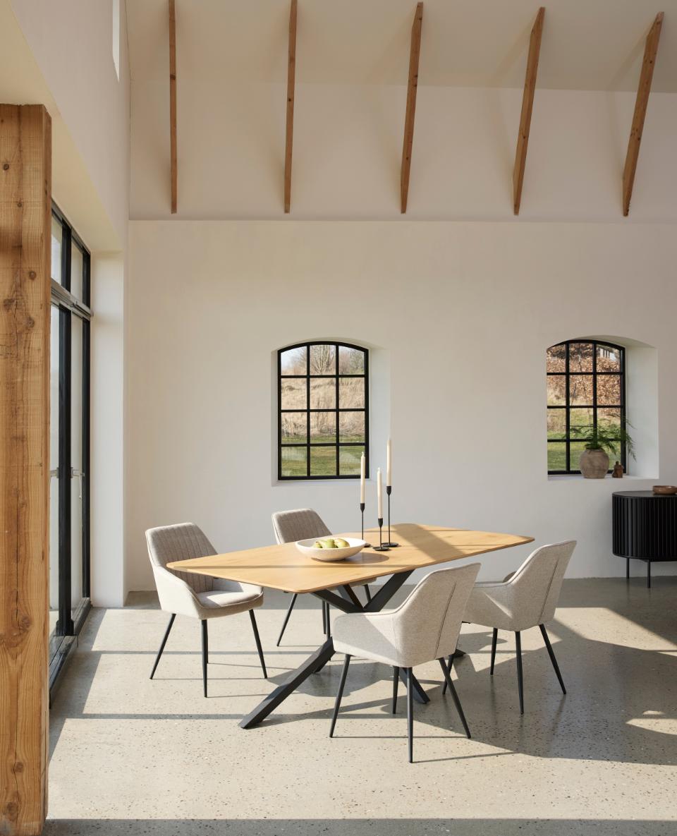 Armlænene giver ekstra komfort og støtte til lange middage. Sand-farven er varm og neutral - passer til de fleste spiseborde. Brego-stoffet er slidstærkt og holder sig smukt i mange år. FSC-certificeringen sikrer ansvarligt skovbrug.