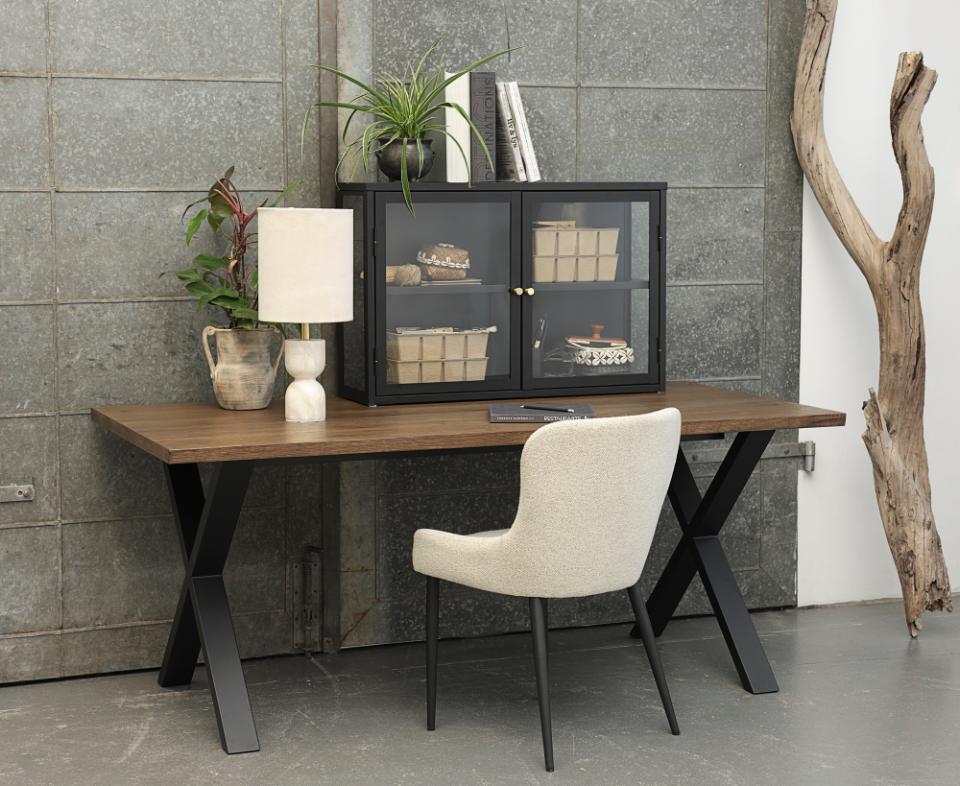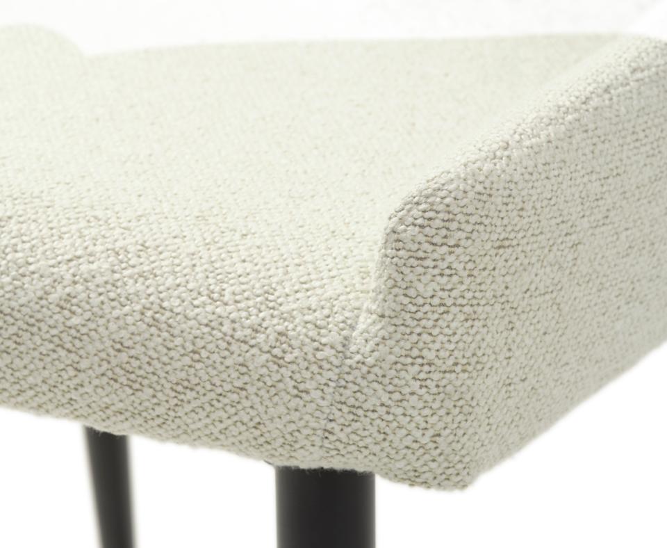 Bouclé-stoffet er ikke bare smukt - det er også praktisk. Med en Martindale-værdi på over 45.000 er det ekstraordinært slidstærkt og holder til daglig brug. Stoffets teksturerede overflade tilføjer visuelt interessante detaljer og skaber dybde. Med armlæn får du ekstra komfort og støtte, når du sidder ved bordet. De sorte metalben skaber en moderne kontrast til den lyse bouclé.