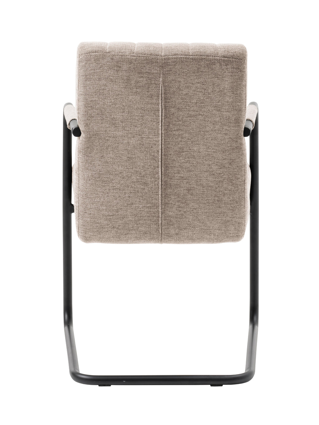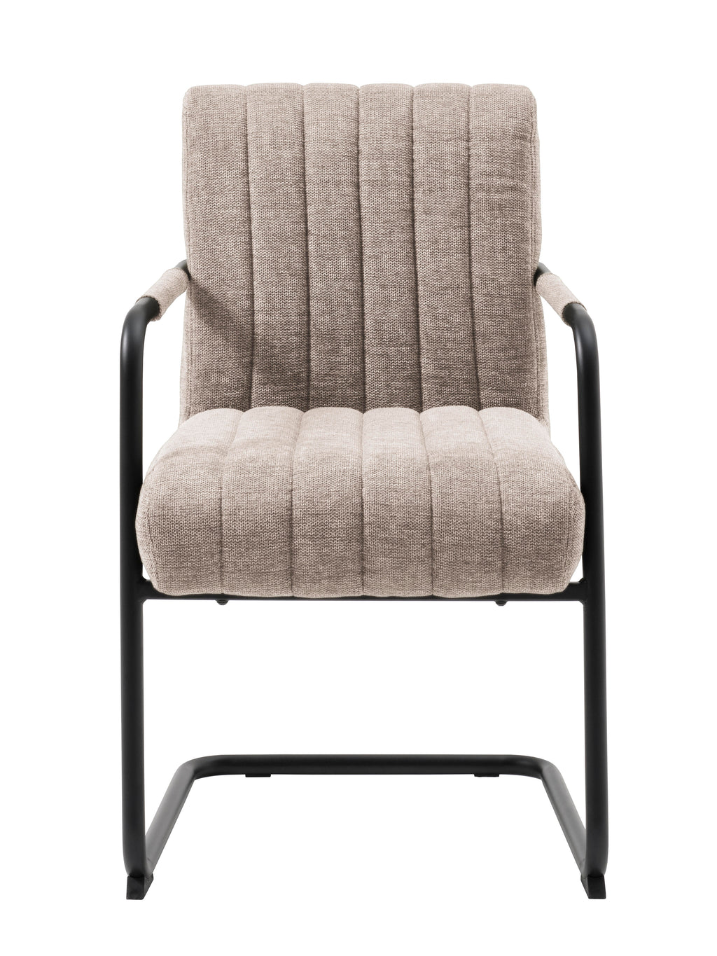 Sælges i sæt af 2 stole - Opgrader din spisestue med Trout stolen i den varme sandfarve. Denne polstrede spisebordsstol med armlæn giver ekstra komfort ved spisebordet, så dine gæster kan sidde længe og nyde måltidet. Det eksklusive Brego-stof og de sorte metalben skaber et elegant og moderne udtryk.