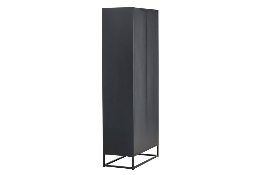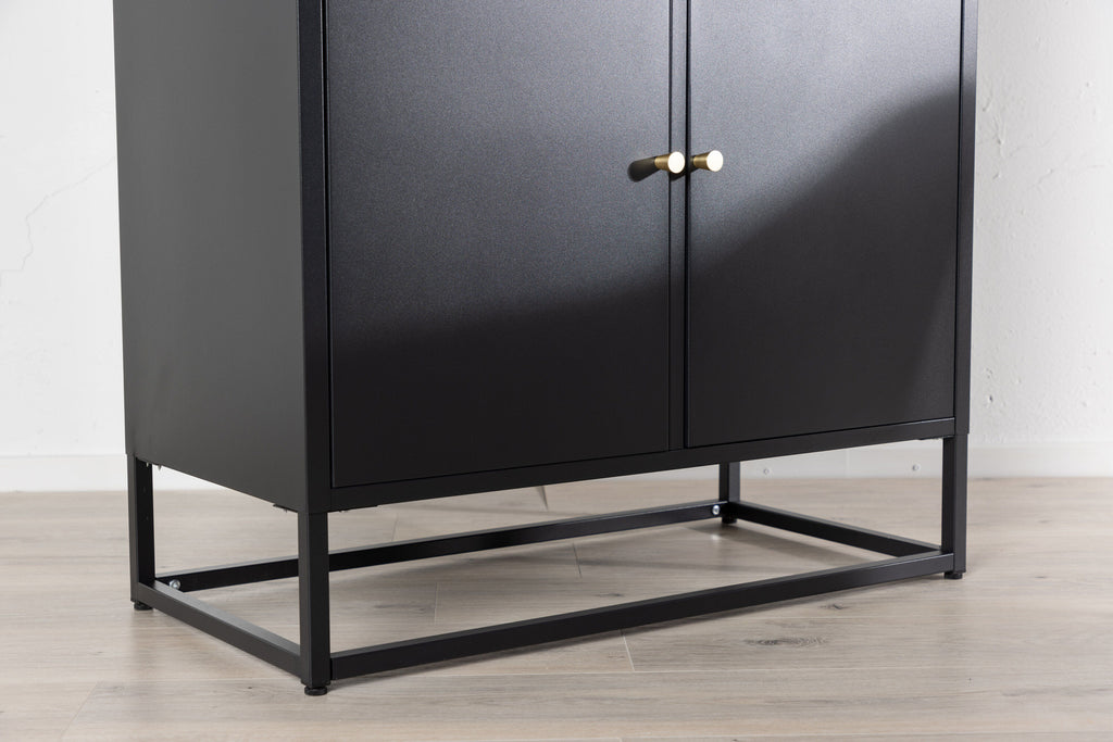 Skabet er fremstillet i pulverlakeret stål i en dyb sort farve, der tilfører rummet et stilrent og sofistikeret præg.