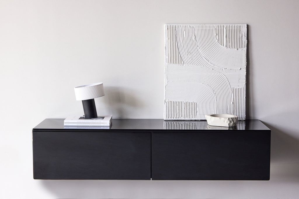 Den minimalistiske konstruktion uden ben giver et svævende og strømlinet look, der passer perfekt ind i skandinavisk og moderne indretning.