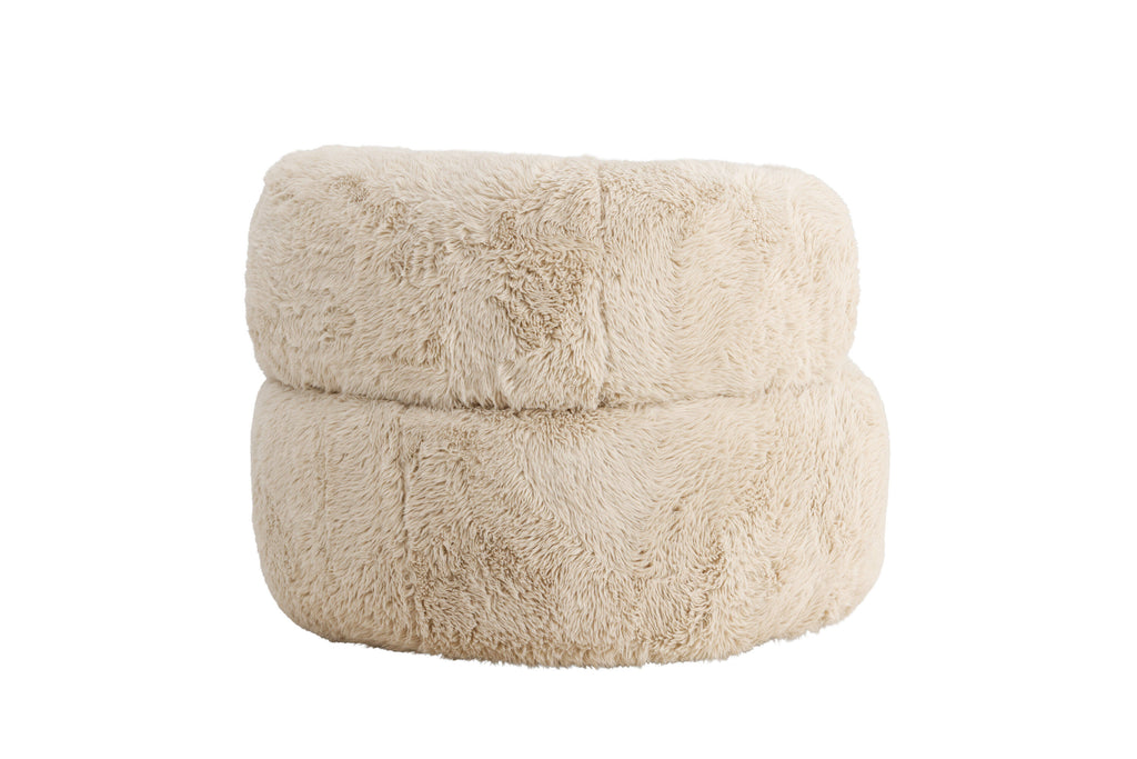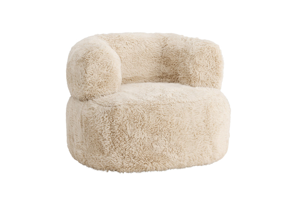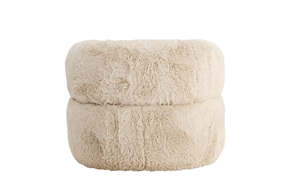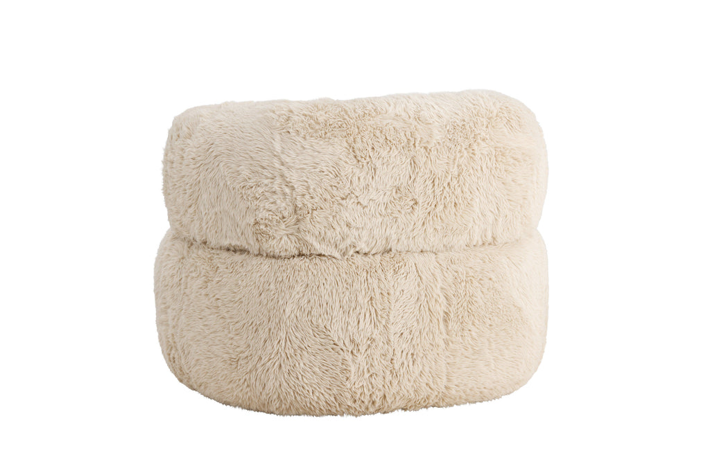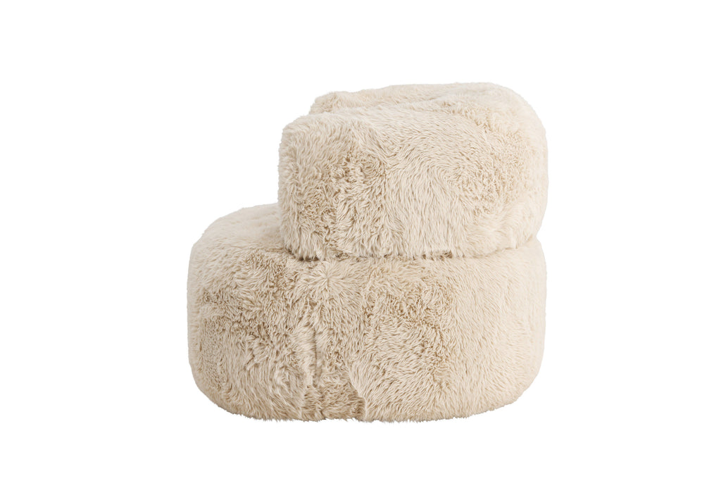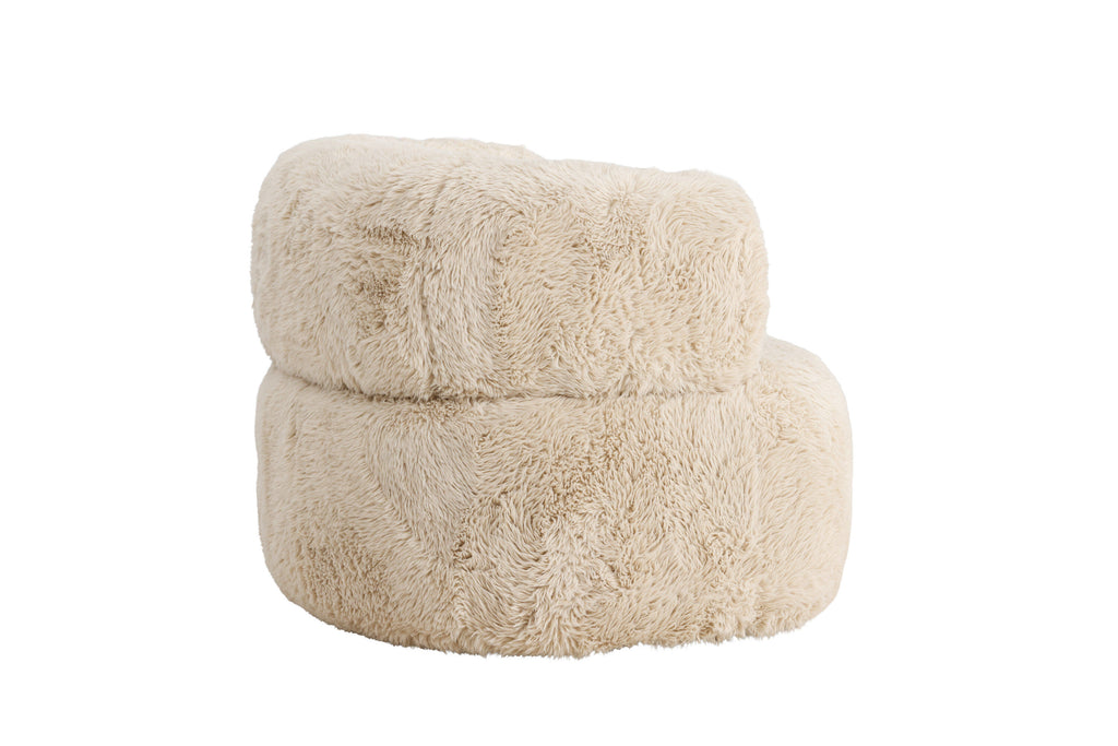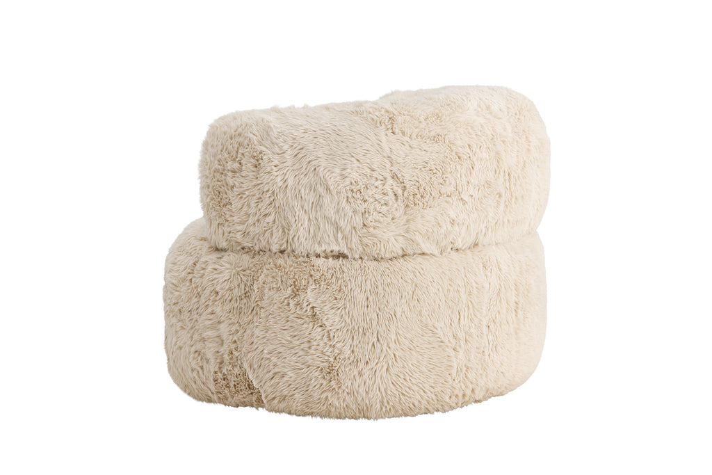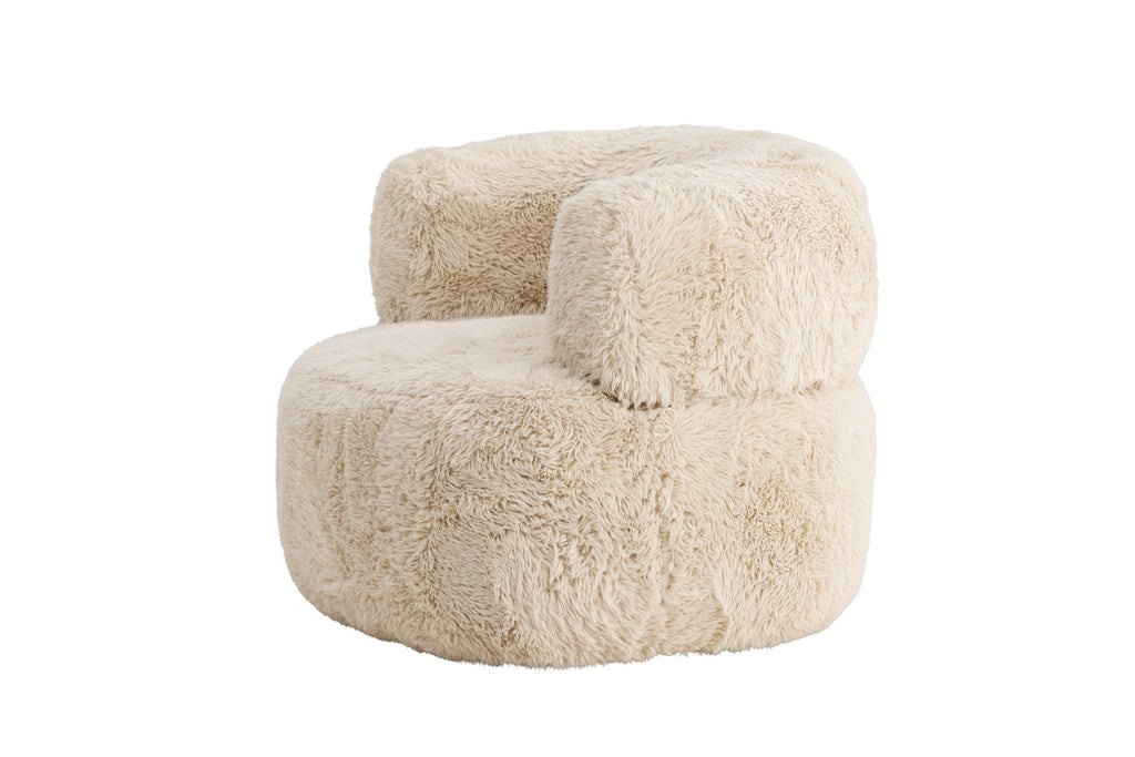 Den gode polstring og den omsluttende form gør den perfekt til afslapning – uanset om det er med en god bog, en kop kaffe eller en lang samtale. Betrækket i offwhite fake fur giver et lyst og friskt udtryk, der passer ind i både moderne, skandinaviske hjem og mere farverige miljøer.