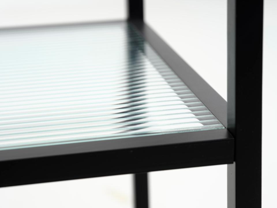 Det stilrene design med rektangulær form og fluted glass. Udseende: Glas med lodrette riller, som skaber et rytmisk og sofistikeret look. Dette giver et moderne udtryk, mens den robuste konstruktion sikrer en bæreevne på op til 25 kg. Vognen er let at køre rundt og kan bruges til alt fra drinks og glas til dekorationer og servering.