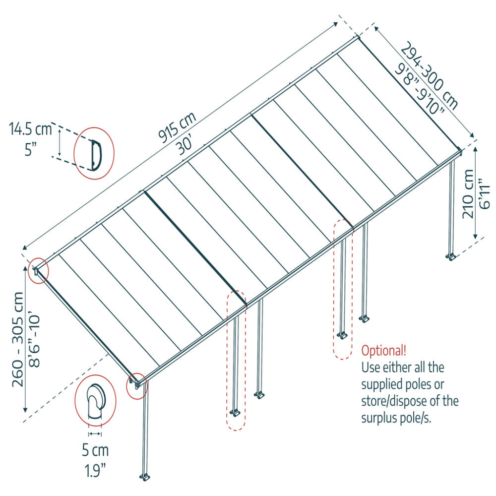 VIGTIGT: Denne Feria terrasseoverdækning består af 3 moduler à 3,05 m bredde med 295 cm dybde, samt to samlekit til at samle de 3 terrasseoverdækninger. Feria kan sammensættes på mange måder med samlekit, så en terrasseoverdækning på 295 cm dybde kan fås i flere forskellige længder.