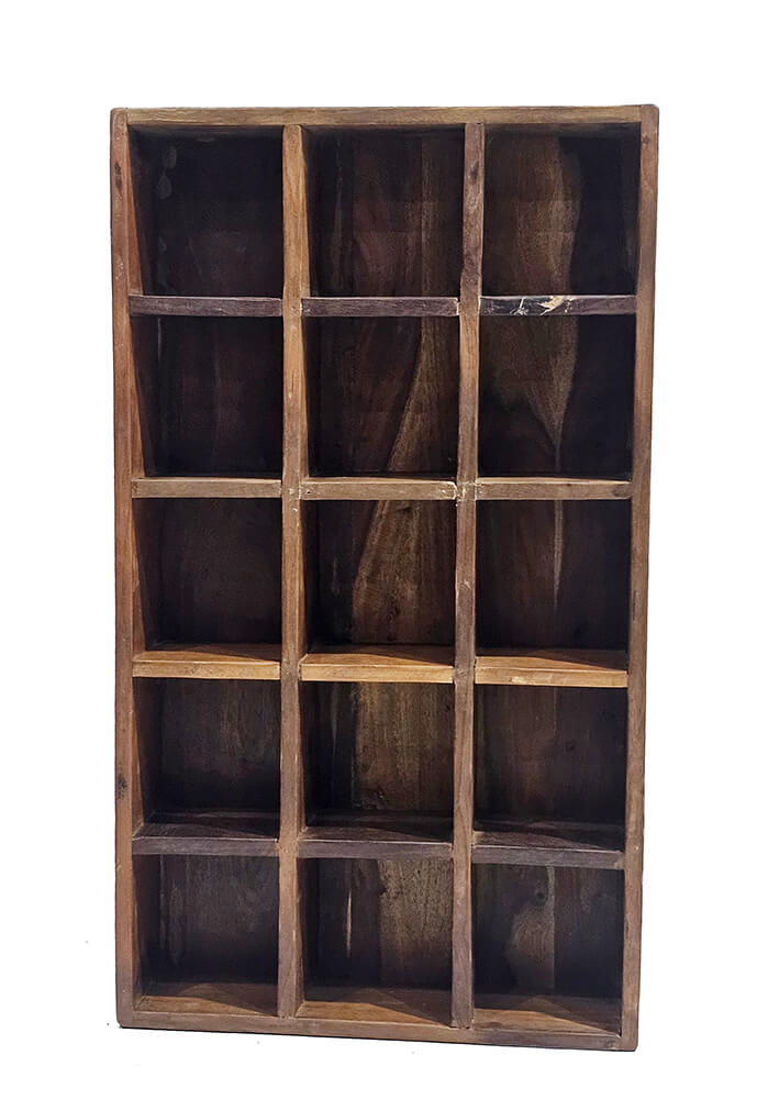 Med hele 15 rum får du rig mulighed for at organisere kopper, krydderiglas eller små dekorationer – og samtidig tilføre rummet et varmt, rustikt udtryk.