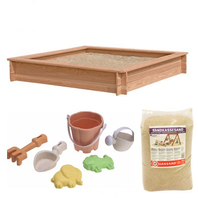 NORDIC PLAY sandkasse i lærketræ inkl. 240 kg sandkassesand og sandkasse legetøj med spand, skovl, vandkande og rive!