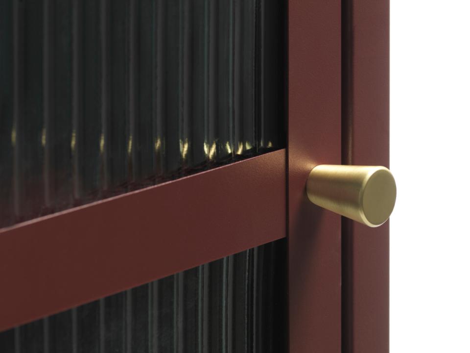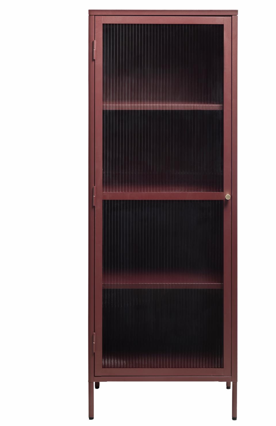 Bronco glasskabet er en alsidig opbevaringsløsning, der kombinerer funktionalitet med moderne design. Det smukke wine red metal (RAL 3005) og riflet glas skaber et elegant og karakterfuldt udtryk, mens det guldfarvede greb tilfører et raffineret touch. Med en højde på 160 cm giver skabet rigelig opbevaringsplads uden at fylde for meget i rummet.