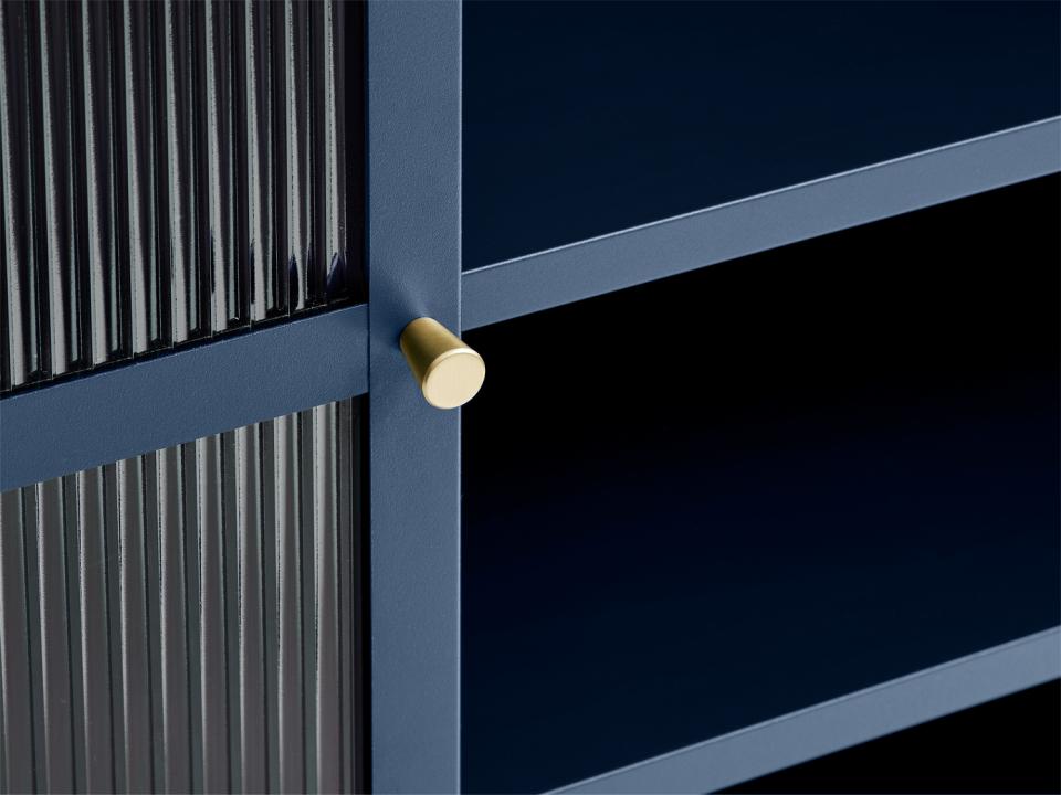 Bronco vitrineskab, blå metal, guldfarvet greb,140x11x40cm