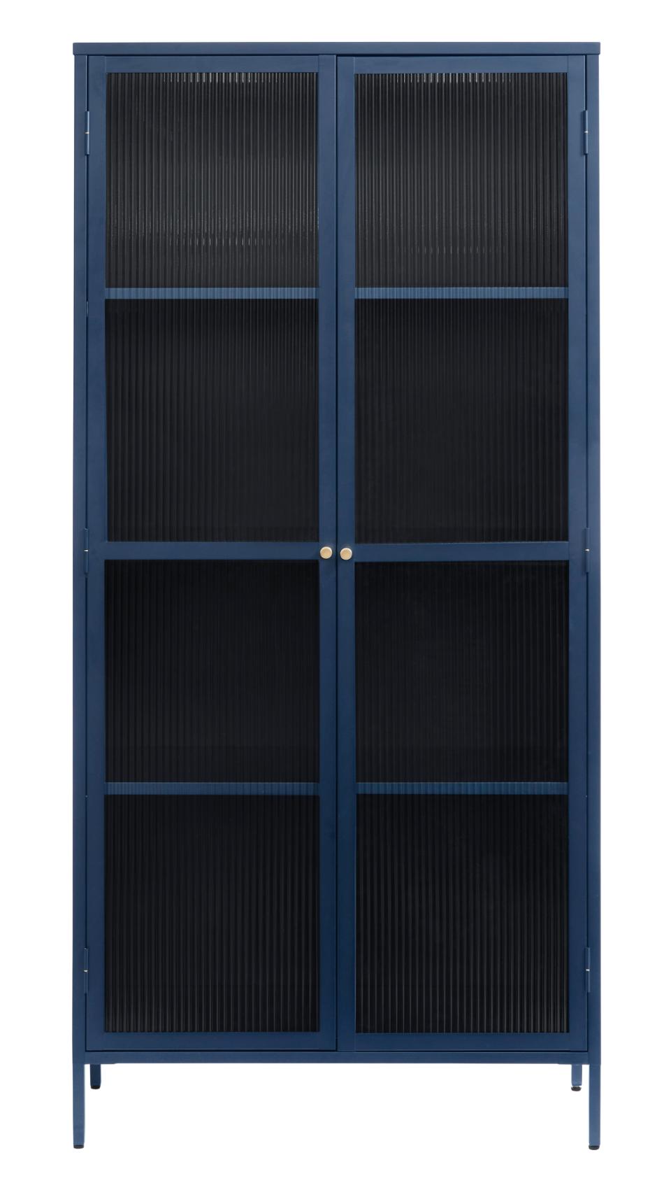 Bronco vitrineskabet er det oplagte valg, når du har brug for ekstra opbevaring. Det fungerer både som praktisk opbevaring og som et dekorativt element, der løfter rummet. Det guldfarvede metalgreb skaber en smuk kontrast til det blå metal og tilfører et eksklusivt touch.