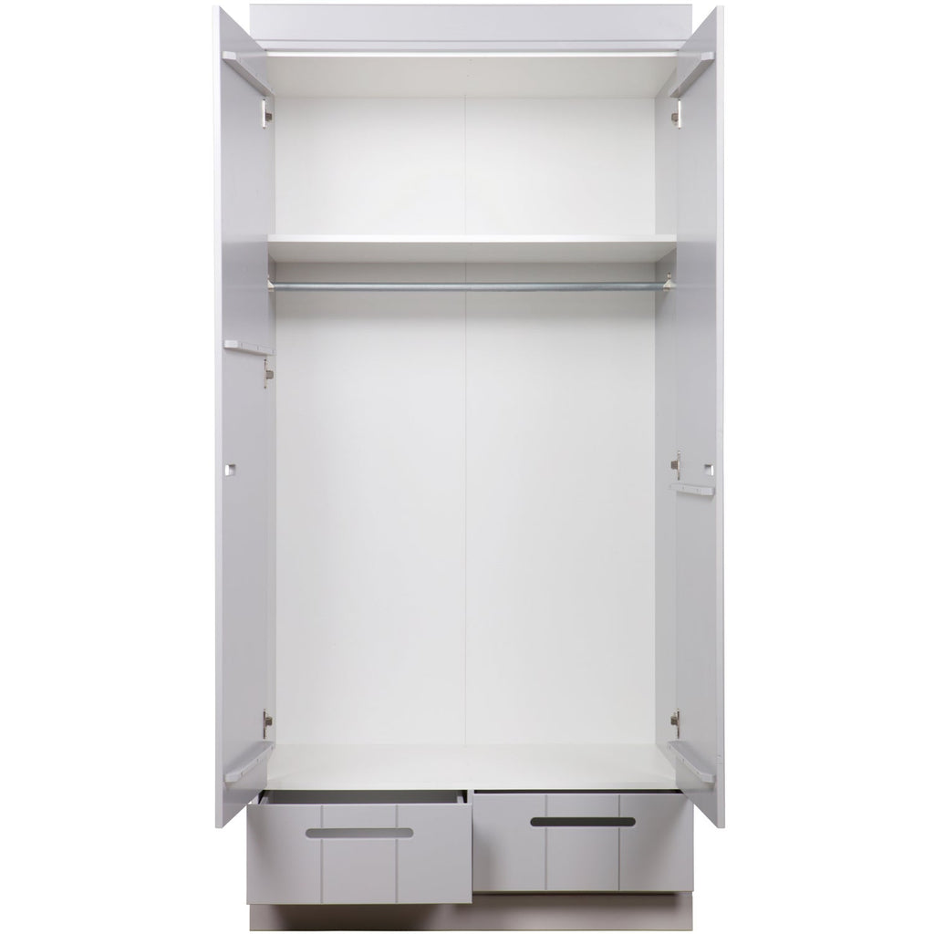 Fra CONNECT-serien: et robust basis 2-dørs garderobeskab med 2 praktiske skuffer (udstyret med robuste metalskuffeguider). Kroppen af CONNECT-skabet er lavet af massiv fyrretræ. Skabene er malet betongrå. Med CONNECT-skabene kan du bygge din egen væg af skabe! Indersiden er udstyret med laminerede hylder, praktisk ved rengøring!
