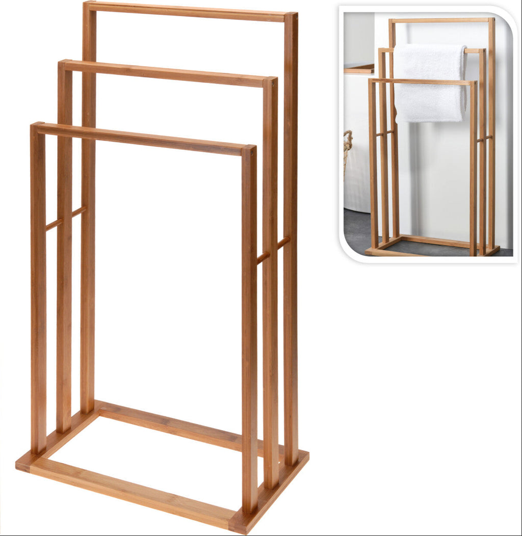 Dette stilfulde håndklædestativ i naturlig bambus kombinerer skandinavisk design med praktisk funktionalitet. Med 3 stænger får du masser af plads til at hænge flere håndklæder, badekåber eller tøj til tørring.