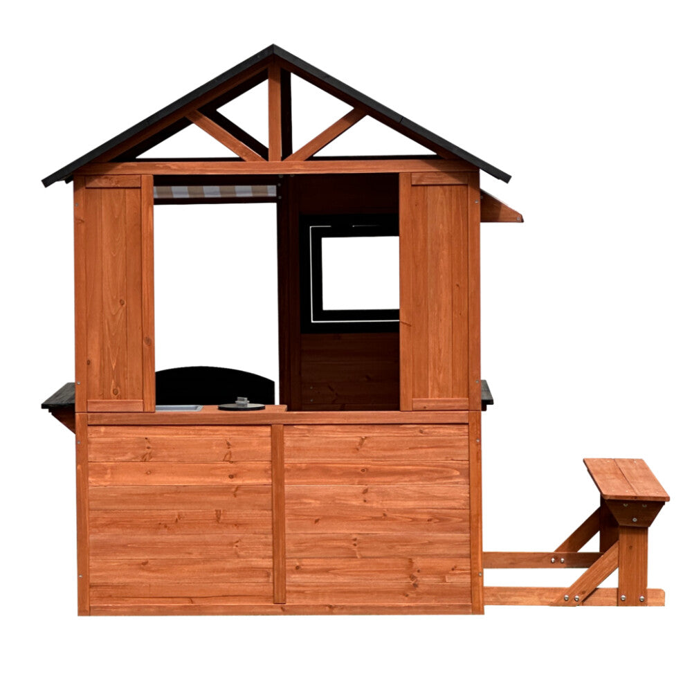 De store åbninger, den halve svingdør og de stribede markiser giver følelsen af lille café, butik eller legehus – kun fantasien sætter grænser. På facaden er der hylde med potter, hvor børnene kan plante eller pynte med deres egne blomster (blomster medfølger ikke).