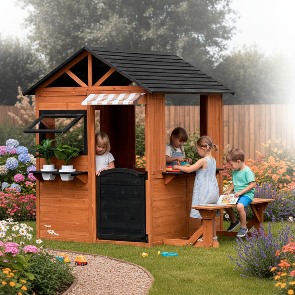 Skab et hyggeligt og kreativt frirum i haven med dette flotte NORDIC PLAY Active legehus i træ. Legehuset er fremstillet i 100% FSC-certificeret træ og leveres med smart serveringsdisk, sidebænk og fine detaljer, der inviterer til rolleleg året rundt.