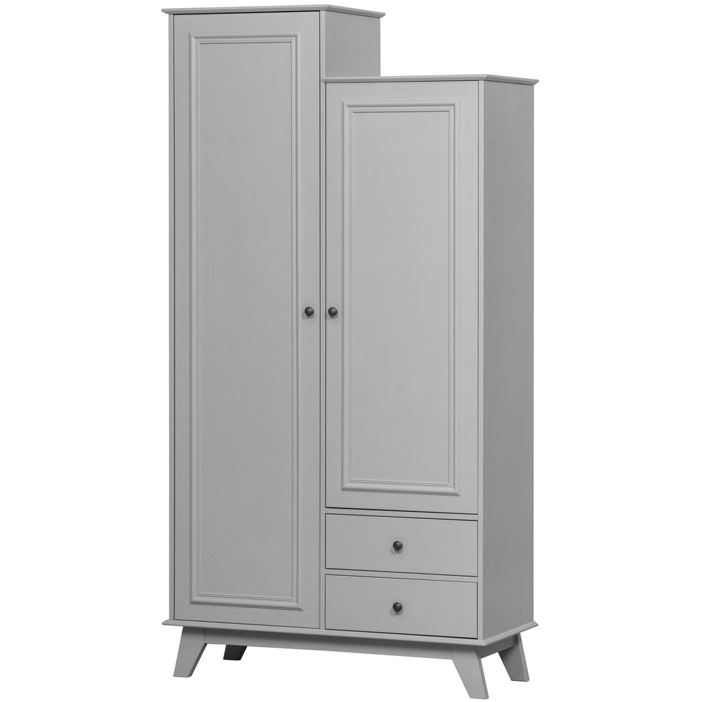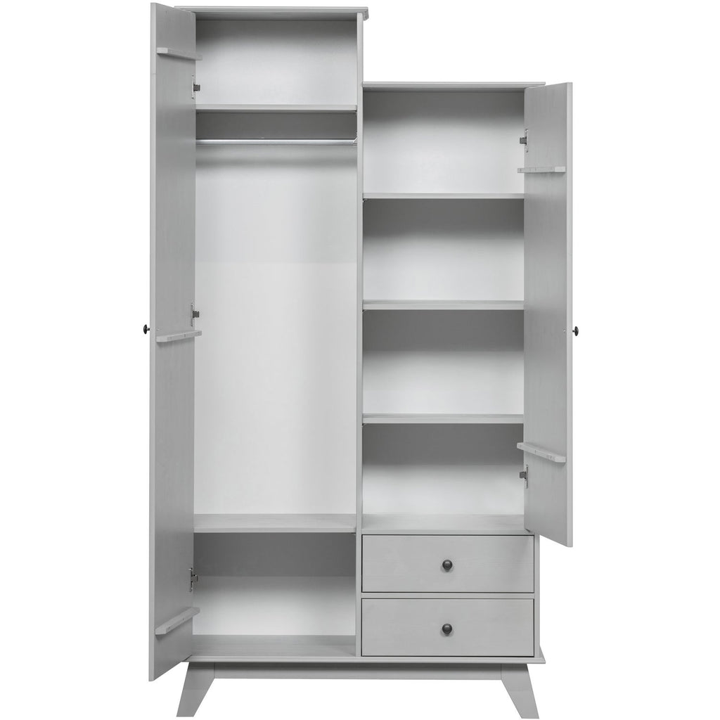 Lily garderobeskabet er ideelt til dig, der søger et unikt og funktionelt skab med rigelig opbevaringsplads. Den varme grå farve skaber et behageligt og tidløst udtryk, mens det asymmetriske design tilføjer en legende detalje. De to skuffer og to døre giver fleksibel opbevaring til tøj, sengetøj og tilbehør. Skabet passer perfekt ind i soveværelset.
