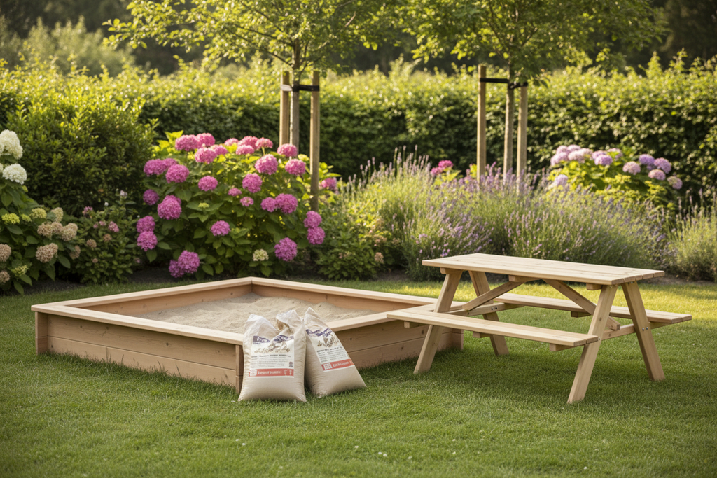 Forestil dig børnene samlet omkring sandkassen, hvor de bygger fantasifulde sandslotte i det bløde, rene sand, for derefter at sætte sig ved bordet med en forfriskning – alt sammen i deres eget lille paradis i haven.