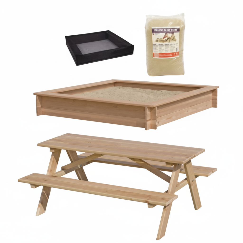 Få alt hvad du behøver til det perfekte legeområde i ét komplet sæt. Dette premium sandkassesæt fra NORDIC PLAY kombinerer en rummelig 150x150 cm sandkasse i naturskønt lærketræ, et praktisk bord/bænkesæt, beskyttende sandkassenet og 200 kg certificeret sandkassesand – klar til leg fra dag ét.
