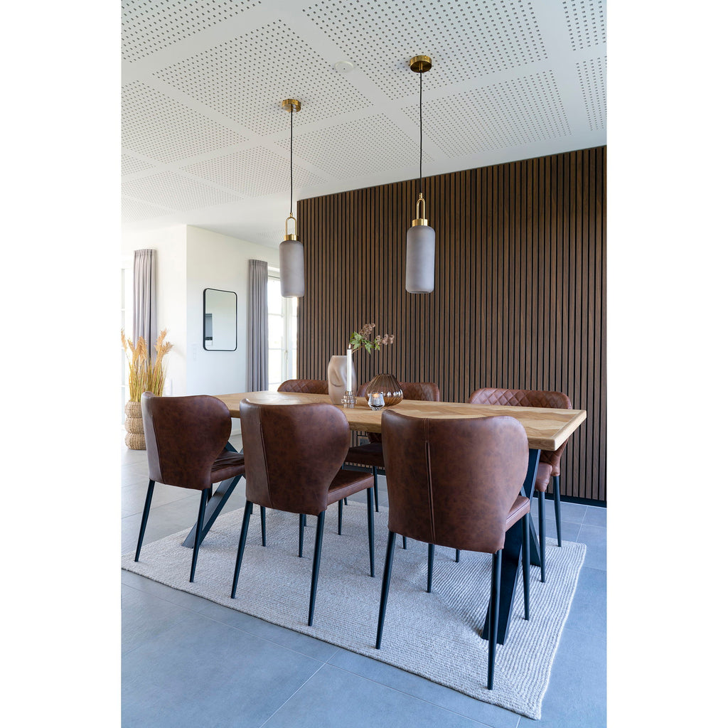 Tilføj stil og funktionalitet til spiseområdet med dette sæt af 2 Pisa spisebordsstole i elegant vintage brun PU læder. Det bløde kunstlæder med let patineret look giver et varmt og indbydende udtryk, mens de slanke sorte metalben sikrer stabilitet og et moderne design.