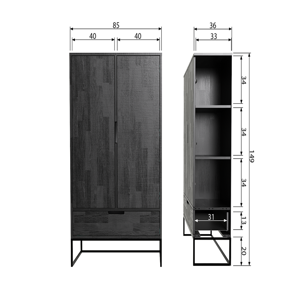 Silas skab med 2 døre er ideel til stuen, hvor det fungerer som et robust og moderne opbevaringsmøbel. Med en bredde på 85 cm og en højde på 149 cm er der rigelig plads til opbevaring, mens dybden på 36 cm sikrer, at skabet ikke fylder for meget i rummet.