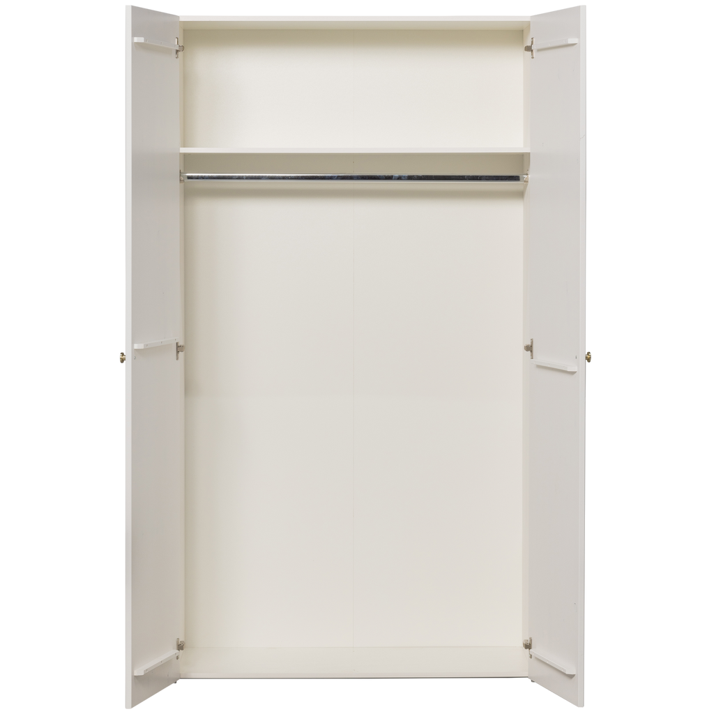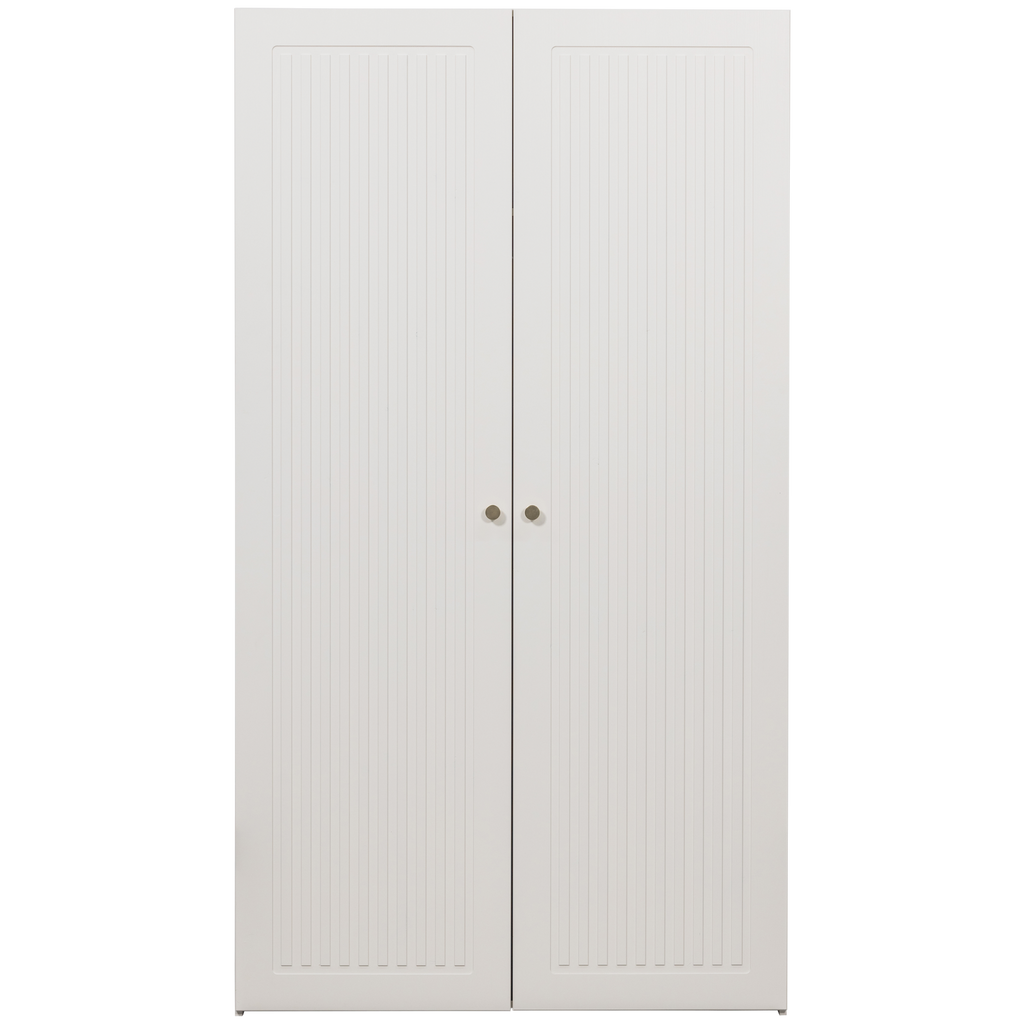 Sipke 2-dørs garderobeskabet er formet af slebet fyr afsluttet i en neutral farve: hvid. Bagsiden af skabet er lavet af presset HDF-materiale med en hvid finish.