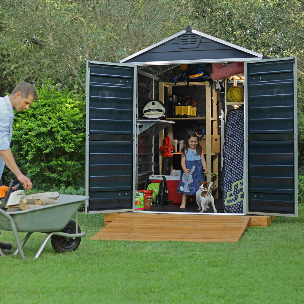 Skuret er ekstremt nemt at samle med det smarte Slide N'Lock panelsystem, og den galvaniserede bundramme i stål sikrer optimal stabilitet. De brede dobbeltdøre med lavt dørtrin giver nem adgang, selv med større havemaskiner.